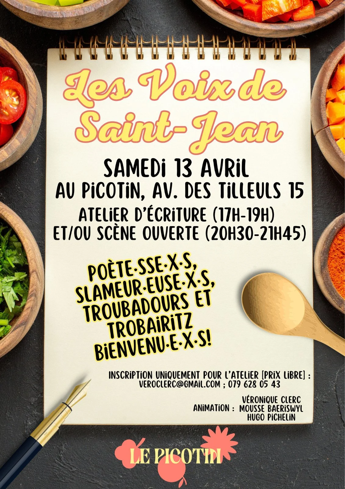 Samedi 13 avril : atelier d’écriture et scène ouverte « Les Voix de Saint-Jean » au restaurant Le Picotin, Avenue des Tilleuls 15, Genève