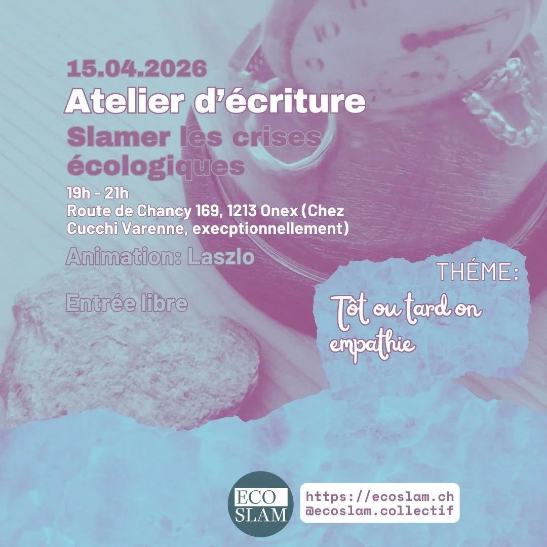Comme chaque mois, le collectif EcoSlam organise son atelier d’écriture gratuit et ouvert à tous : Slamer les crises écologiques.