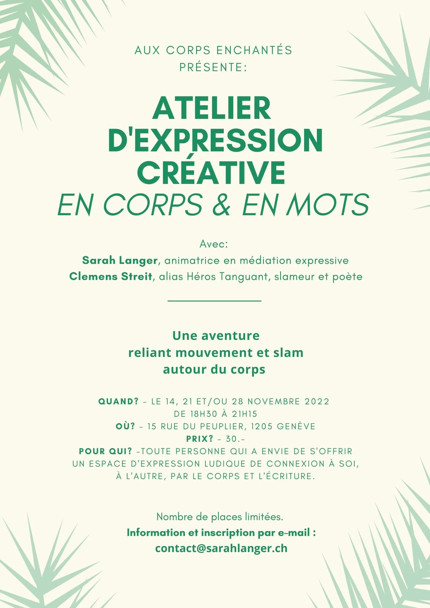 Sous la vieille charpente d’une magnifique salle, Sarah Langer, lumineuse animatrice en médiation expressive, et Héros Tanguant, slameur et poète, vous invitent à des ateliers créatifs en corps et en mots, lieu d’expérimentation pour mieux aligner votre expression orale et le mouvement de votre corps : ce sera les 14, 21 et 28 novembre (dates alternatives ou cumulatives) à Genève.