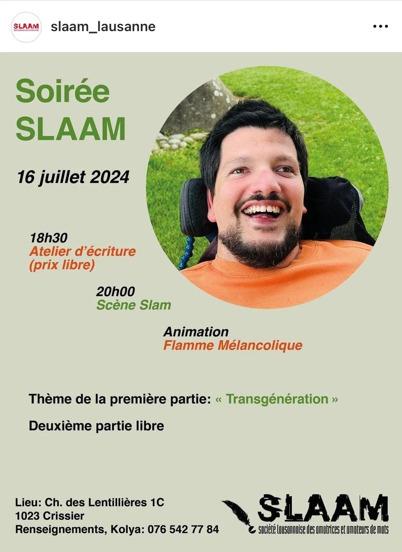 Pour la scène de juillet, venez célébrer avec nous les échanges transgénérationnels ! Nous nous rendrons à cette occasion à la grande salle du chemin de Lentillières 1C à Crissier, pour un atelier et une soirée slam autour du thème « Transgénérations », animés par Flamme Mélancolique.
