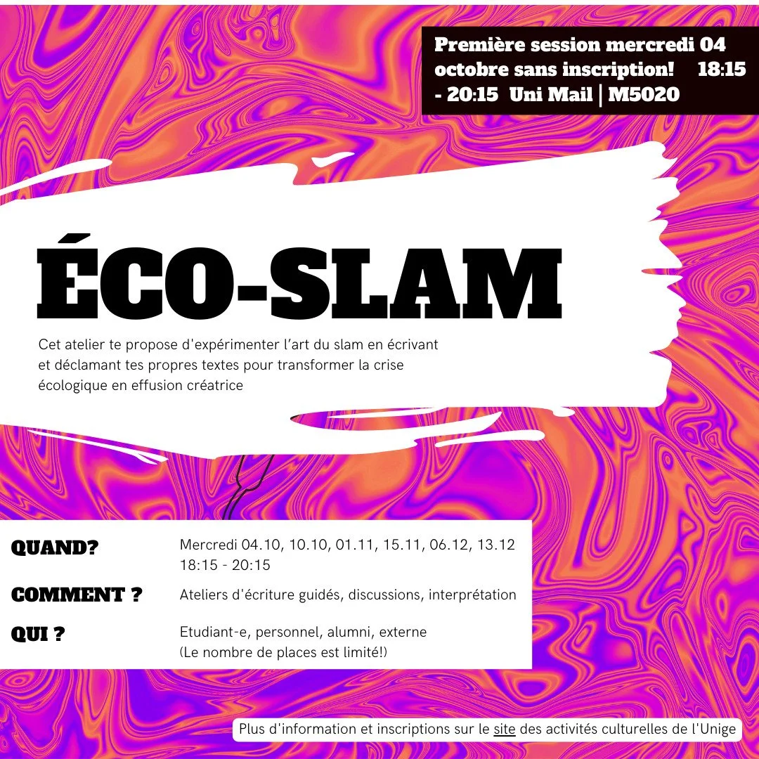 L’Atelier Eco-Slam de l'Unige reprend en octobre! Ouvert à toutes et tous (pas que étudiant.es). Animé par Machu Pitchoune.