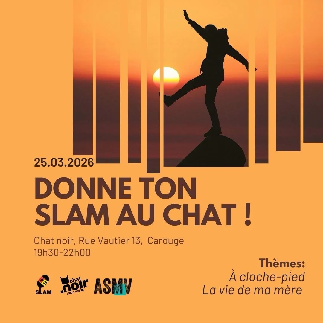 🎤 Soirée SLAM au Chat Noir ! 🎤 Comme chaque mois, GE slam t’invite à une scène ouverte. Les thèmes de la soirée : 💬 « La vie de ma mère» & « À cloche-pied» 💬 📍 Où ? Le Chat Noir – Rue Vautier 13, Carouge 📅 Quand ? Mercredi 25 Mars de 19h30 à 22h 📜 Règles du jeu : 🚫 Pas d’accessoires, pas de musique ⏳ 3 minutes max ✍️ Des textes de toi, pour nous tous 🍷 Un vers dit = un verre offert ! ✨ Sens-toi libre de tordre les thèmes à ta façon… ou de venir poser un texte hors thème. Que tu viennes déclamer ou écouter, la scène est à toi. On se réjouit de t’y voir ! ✨ Vous voulez en savoir plus sur les prochains événements slam en Suisse ou en France, rendez-vous sur (https://geslam.wordpress.com/agenda/). 📸 Photo : Aziz Acharki / Unsplash