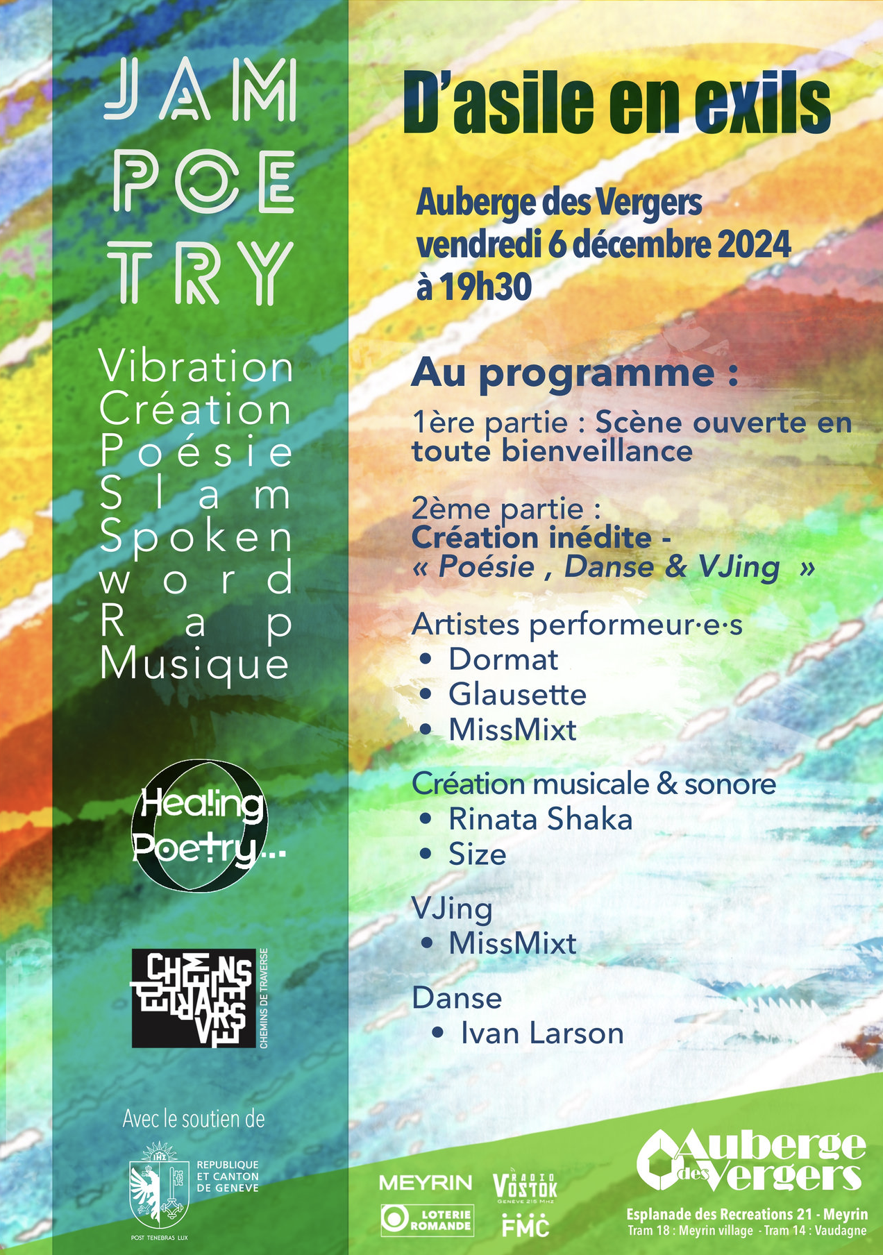 Nous avons le plaisir de vous convier à notre prochaine Jam Poetry qui se tiendra le vendredi 6 décembre à 19h30 à l'Auberge des Vergers (Meyrin).