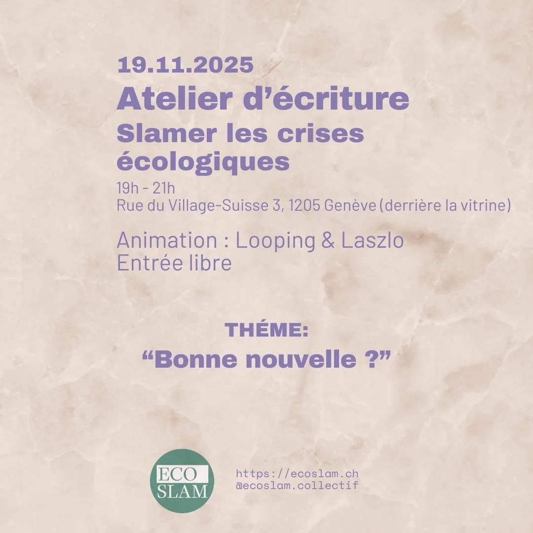 Comme chaque mois, EcoSlam organise son atelier d’écriture : Slamer les crises écologiques. Ce mois-ci, le thème sera : “Bonne nouvelle ?” 🗓️ Date : 19.11.25 📍 Lieu : Dans la salle derrière la vitrine, Rue du Village-Suisse 3, 1205 Genève ⏰ Heure : 19h–21h Entre espoir et ironie, venez questionner ce qui brille — vraie lumière ou simple reflet ? On en fera des mots, des doutes et peut-être… des bonnes nouvelles. 🌤️✨