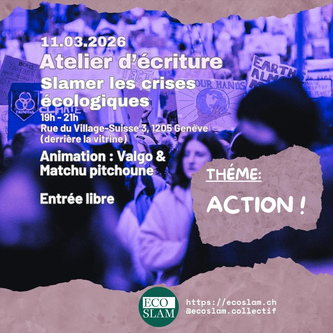 Action ou vérité ? Comme chaque mois, le collectif EcoSlam organise son atelier d’écriture gratuit et ouvert à tous : Slamer les crises écologiques. Ce mois-ci, le thème sera : « ACTIONS ! » 🗓️ Date : 11.03.2026 📍 Lieu : Dans la salle derrière la vitrine, Rue du Village-Suisse 3, 1205 Genève ⏰ Heure : 19h–21h (venez à l’heure svp !) Vous hésitez à venir à l’atelier ? Vous ne savez pas trop ce que c’est ? Relou : ce soir ça ne joue pas pour moi — mais une prochaine fois, vas-y, il y a moyen ! Rendez-vous sur notre site pour plus d’infos sur les ateliers EcoSlam (https://ecoslam.ch/les-ateliers-ecoslam/). Crédit photo: William Gibson - Unsplash