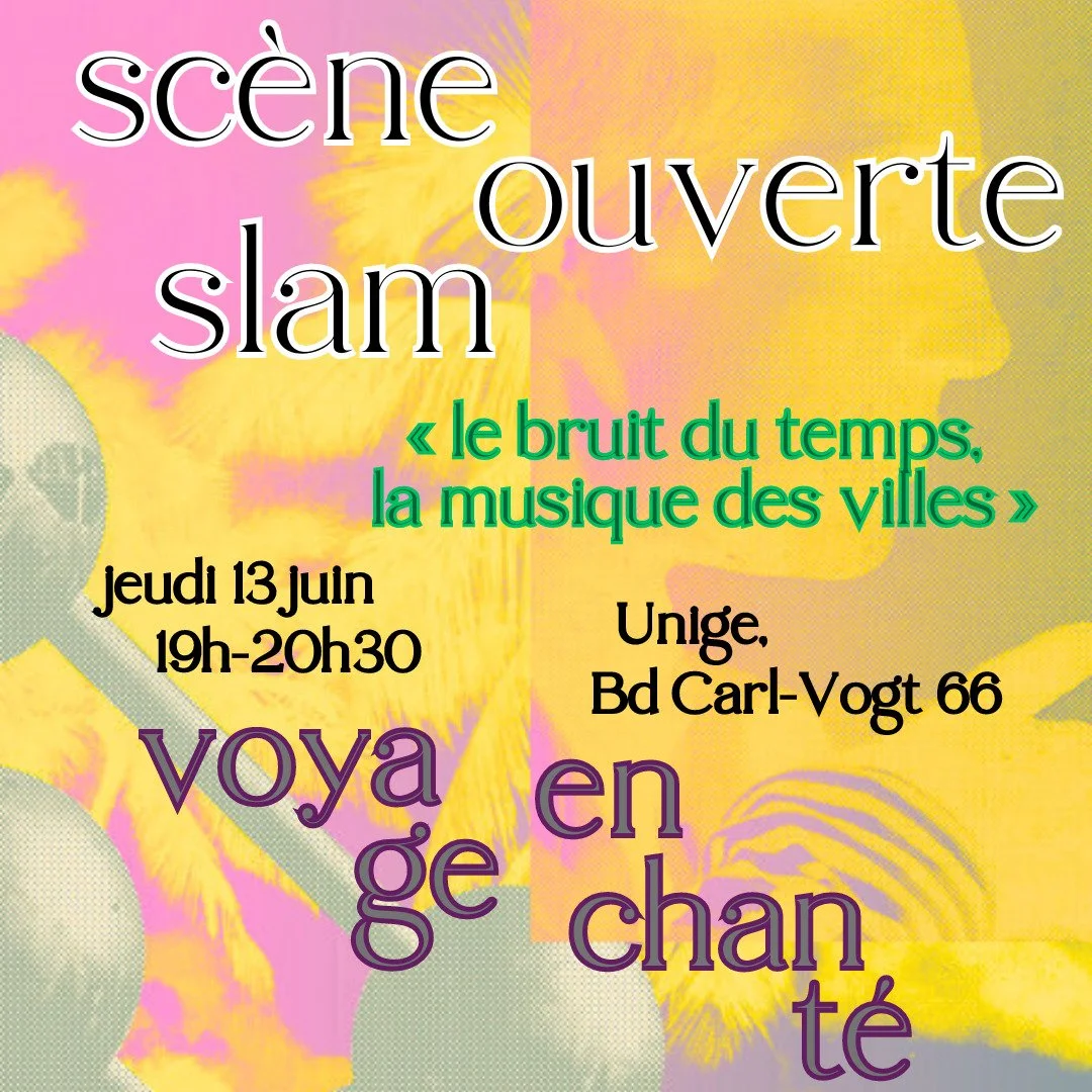 Le collectif Eco-slam vous propose dans le cadre de l'exposition "voyage enchanté", une scène ouverte de slam dans la salle d'exposition de l'université de Genève (Bd Carl-Vogt 66, 1205 Genève), le jeudi 13 juin de 19 h à 20 h 30 !