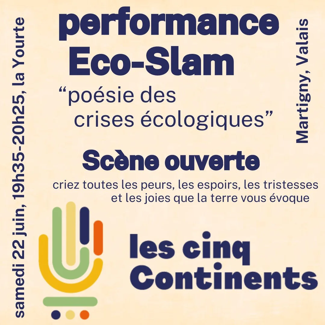 Il y a le tonnerre qui gronde, mais c’est bon, la poésie va sauver le monde. Eco-Slam est un collectif de slameur·euses romand·es qui proposent des ateliers et des interventions poétiques autour de l’écologie, depuis septembre 2022. Le samedi 22 juin, au festival Les cinq Continents à Martigny (Valais), le collectif vous propose de partager ensemble un moment poétique autour des crises climatiques pendant 50 minutes. Au menu, déclamations de textes du collectif et scène ouverte de slam pour que vous puissiez, vous aussi, crier toutes les peurs, les espoirs, les tristesses et les joies que la terre vous évoque.