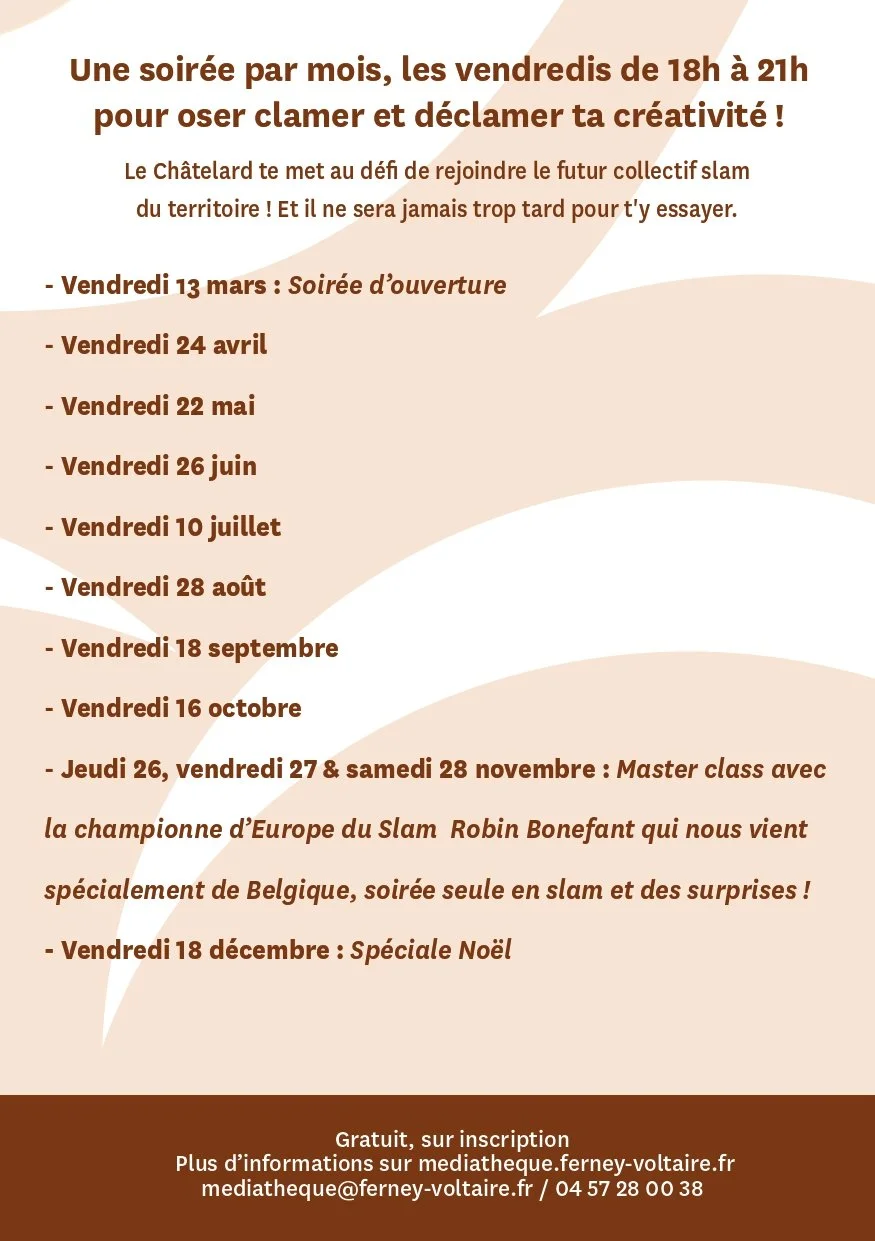 Slampéro (France voisine) vendredi, 13 mars 2026 18:00 vendredi, 18 décembre 2026 21:00 Médiathèque 23 Rue de Meyrin Ferney-Voltaire, Auvergne-Rhône-Alpes, 01210 France (carte) Google Agenda ICS