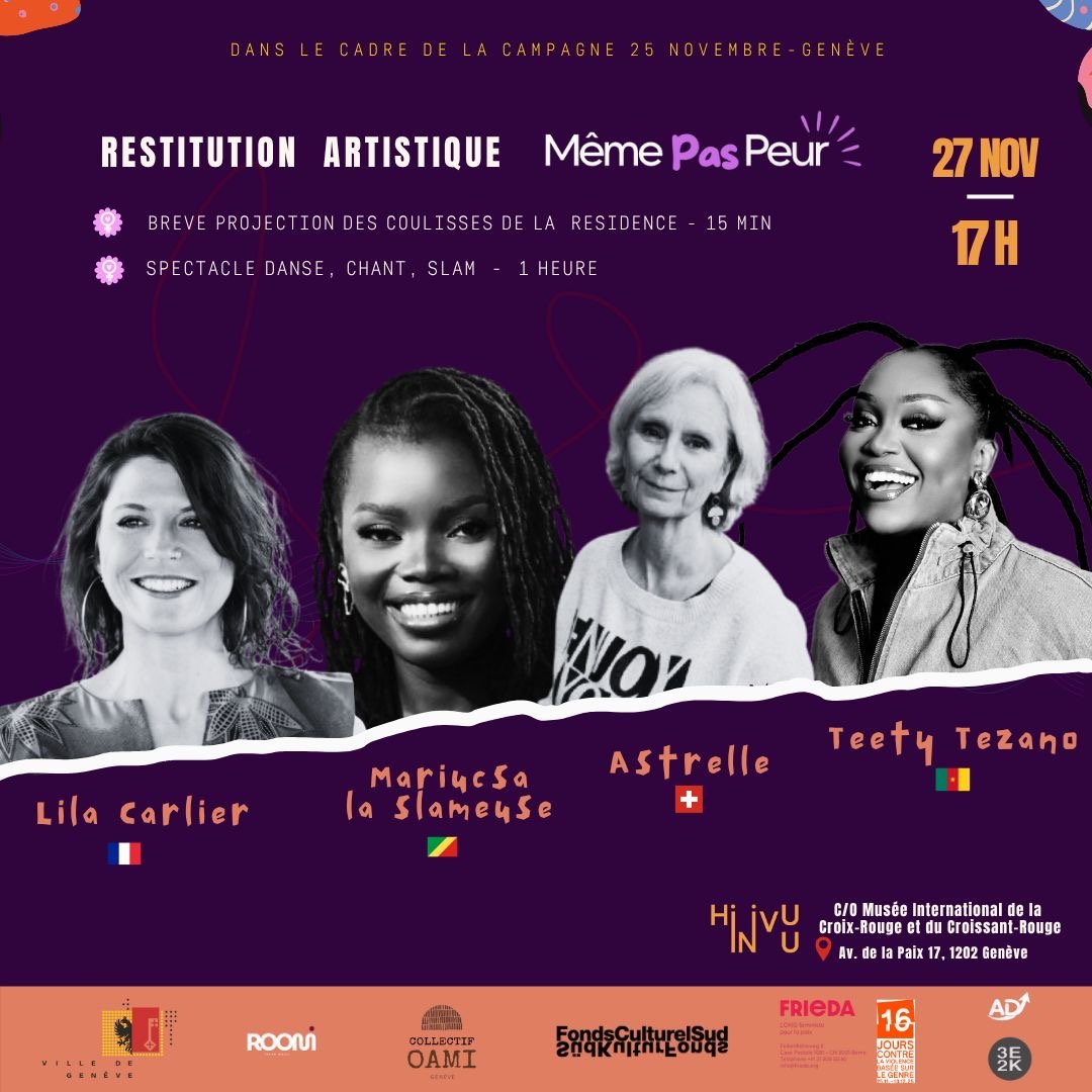#MPP - "Même Pas Peur" est une résidence artistique internationale initiée par l'artiste et militante sociale Teety Tezano, réunissant quatre artistes venues de Suisse, du Cameroun, de France et du Congo. Pensée comme un espace de création, libération et transformations, ce projet place la déconstruction de la peur au coeur de sa démarche artistique et politique. Il s'inscrit dans le cadre de la lutte contre les violences faites aux femmes, en particulier autour de la thématique du culte de la peur, ce mécanisme psychologique et culture qui enferme les femmes dans le silence, la honte, l'isolation, la soumission. La résidence se déroule en Suisse afin de garantir un cadre sécurisé et libre, indispensable aux artistes venant de pays où dénoncer les violences (féminicides, abus, oppression) est dangereux ou impossible.